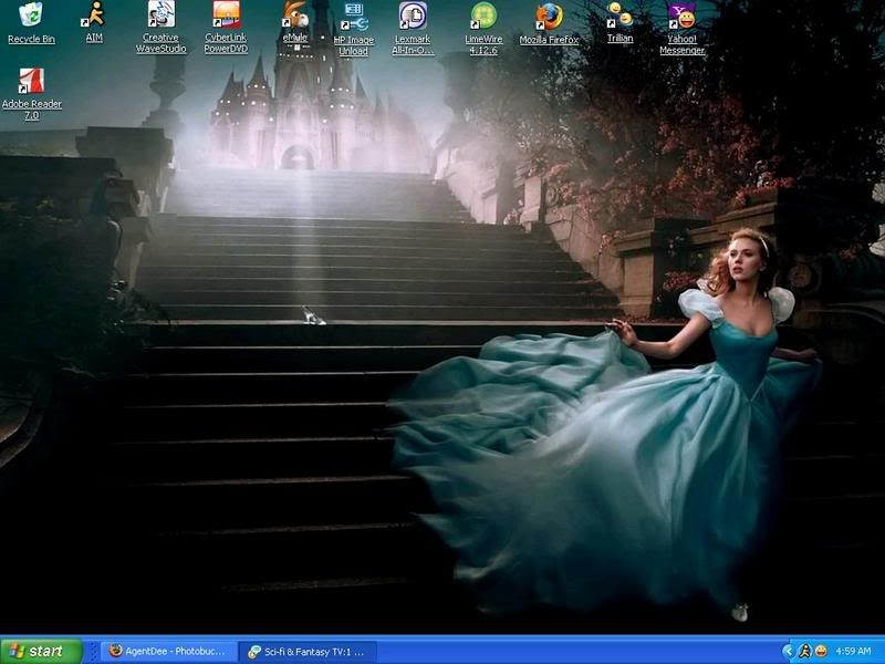 I started using computers when the latest OS was DOS 3.3, so I tend to have the minimal number of programs running as well as a clean desktop (even though I have 512MB of Ram). The image is usually a recent drawing I've worked on, like it is now, although I occasionally rotate the images as I feel the whim.